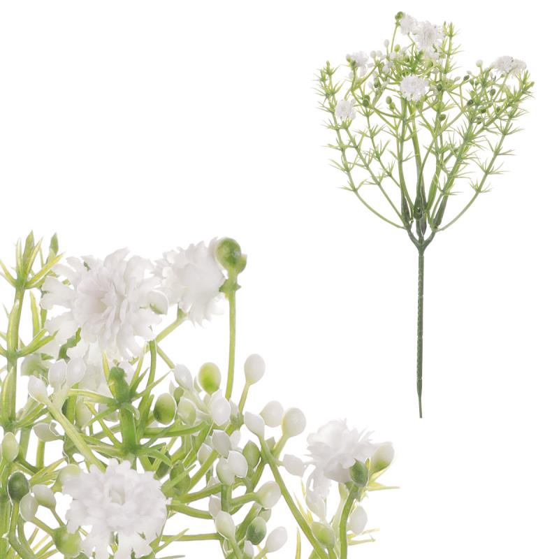 Umělá gypsofila (šáter latnatý) v trsu s bílými kvítky představuje bezstarostnou a trvanlivou alternativu k živé rostlině svého druhu. Svým zpracováním s důrazem na detaily vypadá téměř jako živá. Nikdy neuvadne, neztratí ze své barevnosti a nepotřebuje žádnou péči. Nabízí širokou škálu možností využití, a to i opakovaného. Může být součástí výzdoby interiéru pro vaše vlastní potěšení. Taktéž se hodí do komplexních květinových aranží v místech, kde bude probíhat plánovaná oslava, nebo jiná společenská událost. Výška (cm): 23.00 Šířka (cm): 6.00 Hloubka (cm): 6.00 Hmotnost - netto (kg): 0.00 Ve svazku ks: 6.00 Barva primární: Bílá Materiál: Plast Hmotnost (g): 8.00 Sezóna: Celorok Počet kusů v kartonu: 720.00 Počet kusů v boxu: 72.00 Druh rostliny: Rozměry: cm Hmotnost:0,01 kg Cena je za 18 kusů.