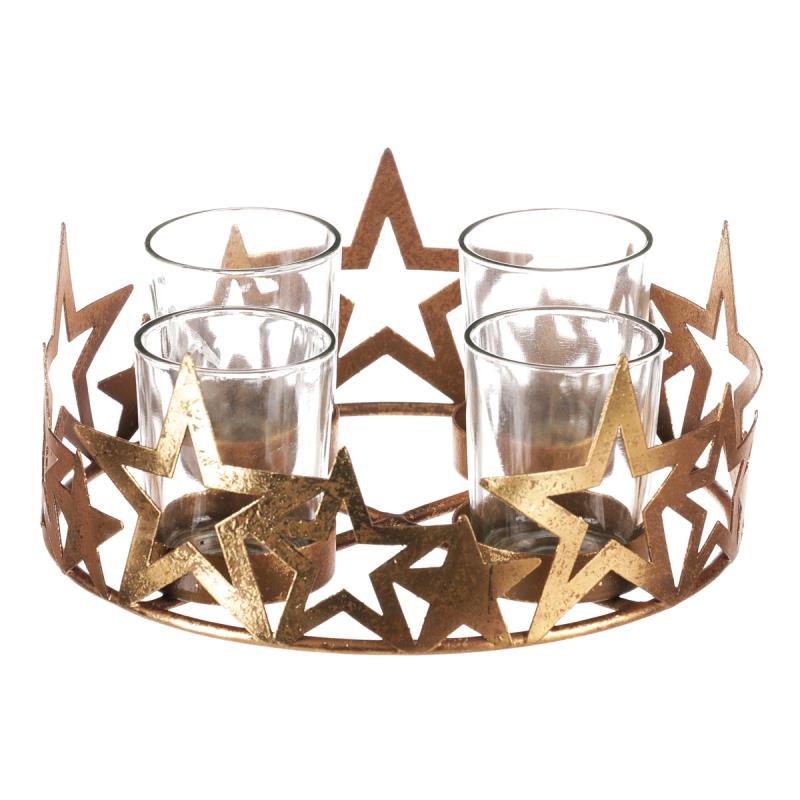 Tento kovový svícen ve zlaté barvě je dobrým základem pro tvorbu vlastní kreativní vánoční a zejména adventní výzdoby. Obsahuje celkem čtyři držáky se skleněnými kalíšky pro vložení svíček a zbytek tvoří ozdobná konstrukce s hvězdičkami. Svojí univerzálností a všestranností nabízí nepřeberné množství využití a je jen na vaší fantazii a dekoračních schopnostech, jak jej případně dozdobit a kam jej nejlépe umístit. Výška (cm): 8.00 Šířka (cm): 18.00 Hloubka (cm): 18.00 Barva primární: Zlatá Materiál: Kov Hmotnost (g): 510.00 Sezóna: Vánoce Alternativní sezóna: Zima Počet kusů v boxu: 2.00 Počet kusů v kartonu: 32.00 Rozměry: cm Hmotnost:0,73 kg Cena je za 2 kusů.