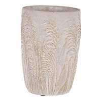 Šedá betonová váza je skvělým prostředkem, který umocní krásu vašich květin, či jiných ozdob v ní umístěných. Její jednobarevné provedení s motivem rozkvetlých travin vytváří elegantní a vkusný design. Betonový obal má nespornou výhodu v tom, že je těžší a poskytuje vyšší stabilitu. Je zcela nepropustná, a když je třeba, zadržuje vodu a chrání okolní prostředí před vlhkostí. Naopak rostlinám poskytuje lepší podmínky, takže i řezané květiny vydrží delší dobu v dobré kondici. Váš interiér tím obohatíte o vkusný dekorativní prvek, který bude plnit estetickou i praktickou funkci na jedničku. Výška (cm): 26.00 Sezóna: Celorok Hloubka (cm): 17.00 Šířka (cm): 17.00 Materiál: Beton Barva primární: Šedá Sada více kusů: Ne Průměr (cm): 15.00 Tvar: Kruhový Počet kusů v boxu: 1.00 Počet kusů v kartonu: 4.00 Hmotnost (g): 2750.00 Rozměry: cm Hmotnost:3 kg