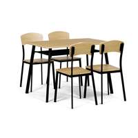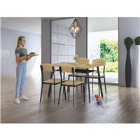 Jídelní set značky Autronic pro čtyři osoby kombinuje praktický design s moderním industriálním stylem. Stůl s obdélníkovou deskou v dekoru dubu a čtyři židle s černými kovovými nohami přinášejí do interiéru elegantní kontrast. Desky z MDF jsou pevné a odolné, což zajišťuje dlouhou životnost nábytku. Díky svým rozměrům je tento set ideální volbou pro rodinné stolování v menších i středně velkých jídelnách. Stylový a jednoduchý vzhled se snadno začlení do jakéhokoli moderního interiéru. Počet kusů v kartonu: 1.00 Počet balení: 1.00 Šířka (cm): 110.00 Šířka stolu (cm): 110.00 Karton 1 (cm): 15x115x72 Tloušťka desky (cm): 2.00 Barva primární: Hnědá Skupina zboží: Jídelní set s 4 židlemi Hmotnost - netto (kg): 31.50 Šířka sedu (cm): 38.50 Šířka židle (cm): 38.50 Místo pro počet osob: 4.00 Hloubka židle (cm): 47.00 Styl: Industriální Dekor desky: Dub Hloubka (cm): 70.00 Montáž: Vyžaduje montáž Výška židle (cm): 84.50 Hmotnost - brutto (kg): 33.00 Hloubka sedu (cm): 39.00 Rozměr nohy (cm): 4 x 2 / 3 x 1,5 Výška sedu (cm): 45.00 Rozklad: Ne Hloubka stolu (cm): 70.00 Barva nohou: Černá Světlá výška (cm): 73.50 Výška stolu (cm): 75.50 Výška (cm): 76.00 Demontované: Ano Materiál: MDF Materiál desky: MDF Průřez nohy: Obdélníkový Tvar desky: Obdélníkový Materiál nohou: Kov Místnost: Jídelna Highlight 1: Set, stůl + 4 židle Barva desky: Hnědá Rozměry: cm Hmotnost:32,5 kg