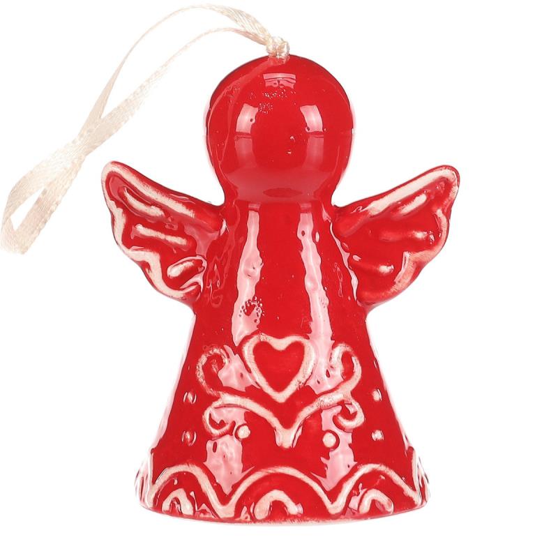 Závěsný vánoční zvoneček ve tvaru anděla vypadá jako sladká perníková pochoutka. Jeho červená „poleva“ s jemnými bílými ornamenty dodává dekoraci slavnostní a hravý vzhled. Perfektní doplněk na vánoční stromek nebo jako doplněk sváteční výzdoby v interiéru. Hmotnost - netto (kg): 0.04 Objem celkem (m3): 0.00 Materiál: Keramika Sezóna: Vánoce Barva primární: Hnědá Počet kusů v boxu: 8.00 Mix druhů: Ne Hloubka (cm): 4.00 Hmotnost (g): 40.00 Šířka (cm): 5.00 Počet kusů v kartonu: 64.00 Výška (cm): 7.00 Rozměry: cm Hmotnost:0,06 kg Cena je za 8 kusů.