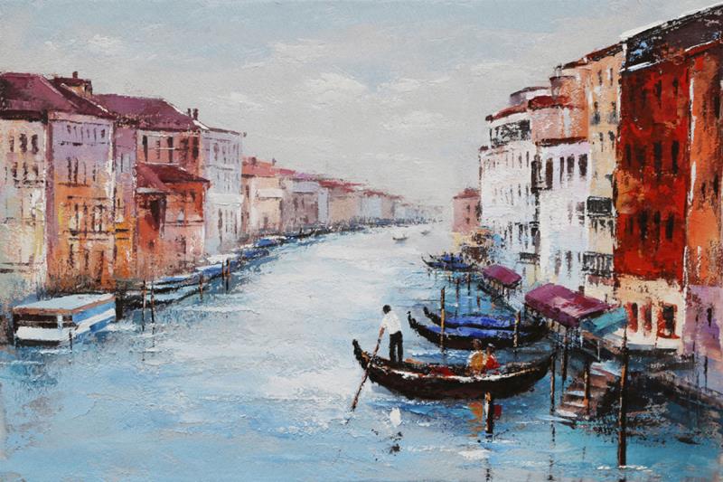 Ruční olejomalba na plátně zachycuje malebnou scenérii Benátek s typickými gondolami a historickými budovami lemujícími kanál. Dominantní modré odstíny vody a oblohy vytvářejí klidnou atmosféru, zatímco detailní zpracování štětcem podtrhuje texturu plátna a živost barev. Obraz je vhodný pro zavěšení v obývacím pokoji, kanceláři nebo galerii, kde přinese nádech italské romantiky a uměleckého dojmu. Rozměry: 80x120 cm Hmotnost:2,5 kg
