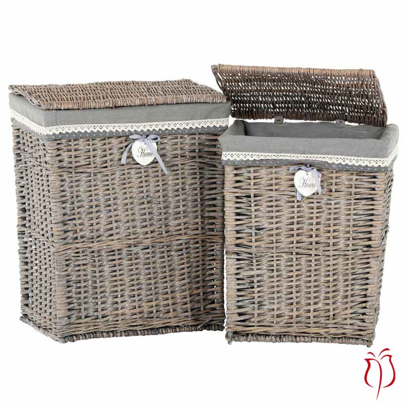 Sada dvou proutěných prádelních košů v šedém odstínu nabízí praktické a zároveň stylové řešení pro ukládání prádla. Koše jsou vyrobeny z pevného proutí s látkovou výstelkou v přírodních tónech, která chrání obsah a usnadňuje údržbu. Každý koš je vybaven víkem, které zajišťuje diskrétní uschování prádla a přispívá k celkovému estetickému dojmu. Dekorativní krajka a srdíčková ozdoba dodávají výrobku jemný rustikální charakter. Vhodné do koupelen, ložnic i prádelních místností pro efektivní organizaci prostoru. Rozměry: 44x33x57,38x27x48cm Hmotnost:4 kg