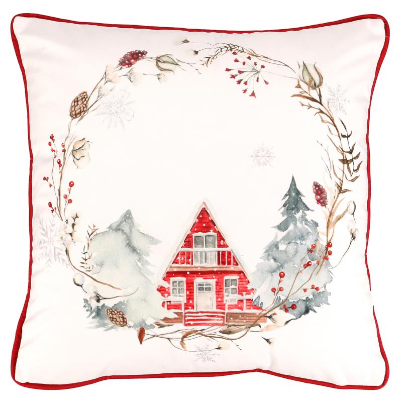 Polštář o rozměrech 45 x 45 cm, s vánočním vzorem, bude ideální dekorací na pohovku, či gauč v době svátků. Obrázek červené chaloupky a zasněžených stromů na bílém podkladu s červenými okraji, dodá polštáři na krásném zimním designu. Rozměry: cm Hmotnost:0,58 kg Cena je za 2 kusů.