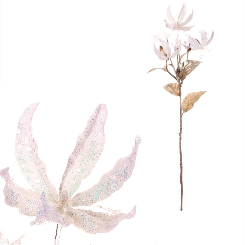 Umělá gloriosa s krémově zbarvenými květy, zlatými lístky a jemnými třpytkami přidá do vánoční výzdoby nádech luxusu a elegance. Tento květ na stonku je ideální pro vytvoření působivého svátečního aranžmá, které rozzáří váš interiér. Objem celkem (m3): 0.00 Počet kusů v boxu: 12.00 Materiál: Textil Počet kusů v kartonu: 144.00 Šířka (cm): 17.00 Hloubka (cm): 15.00 Barva primární: Bílá Sezóna: Vánoce Výška (cm): 65.00 Hmotnost (g): 32.00 Druh rostliny: Mix druhů: Ne Rozměry: cm Hmotnost:0,07 kg Cena je za 4 kusů.