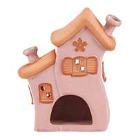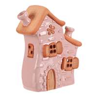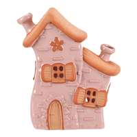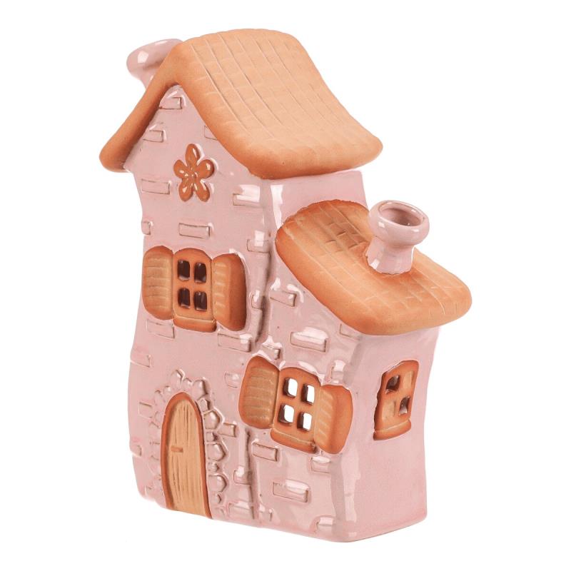 Keramický domeček v růžovém odstínu je určený pro umístění čajové svíčky, která v něm vytváří příjemnou atmosféru. Jeho detailní zpracování zahrnuje reliéfní okna s okenicemi, dveře a komín, které dodávají dekoraci pohádkový charakter. Povrch je hladký a lesklý, což podtrhuje jemné barevné tóny a přispívá k snadné údržbě. Domeček střední velikosti je vhodný jako dekorativní prvek do interiérů, kde zaujme svou jemností a teplým vizuálním efektem.